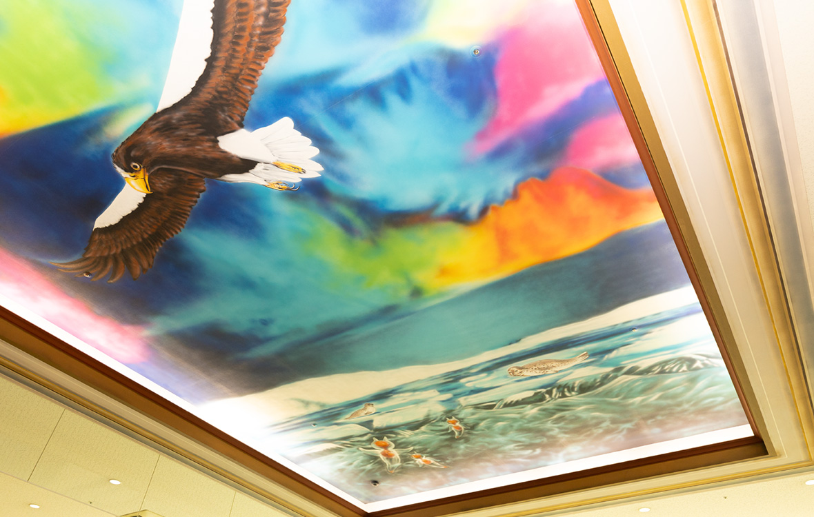 咦,在這樣的地方也有?館內的精美繪畫為吃飯時間增添色彩。